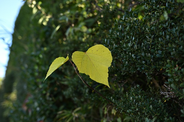 松葉坂の上に建つお屋敷には立派な防風林があります。秋、常緑樹の間からニョキニョキ黄葉がのぞいていました。