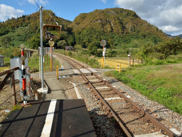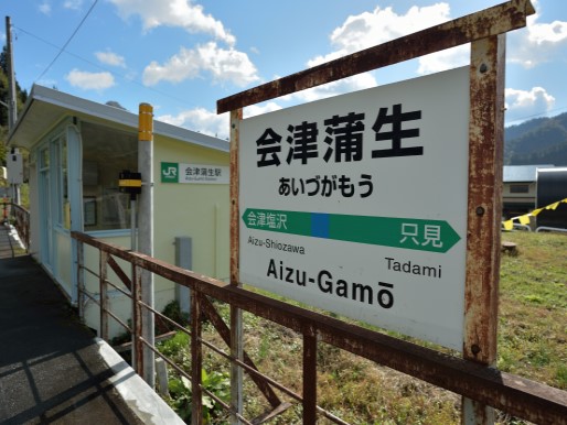 さて、会津蒲生駅近くの駐車場に車を停めて登山の準備をしていると、踏切が鳴り出しました。只見線の電車が走っているのが見えたので、急いでカメラを持って線路を見渡せる場所に移動しました。まもなく、会津蒲生駅を出る電車が見えたので、レンズを20mm広角レンズから付け替える暇もなく急いでシャッターを切りました。後で駅構内のダイヤを見てわかったのですが、この区間の電車は1日3便しか運転されていません(ちなみに下りは会津蒲生駅を9時、16時、19時のみ)。撮った写真3枚のうち、1枚はレンズのフードが適正についておらず画面にフードの影があってボツ、もう1枚は肝心の電車がピンボケでした。いかに焦っていたかがわかるというものです。冒頭の電車の写真はまともに写っていた残りの1枚です。