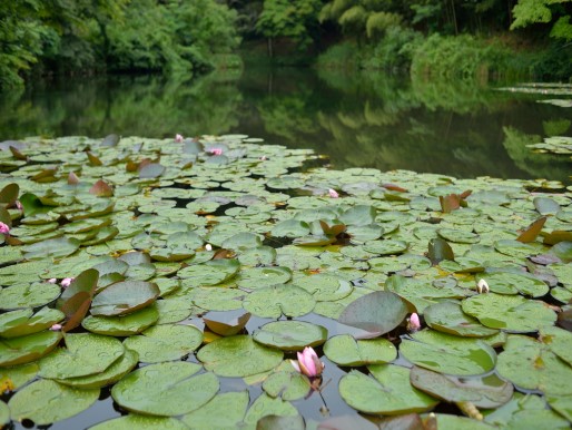 丹羽長重の墓は白河市街の外れの小南湖の奥の中腹にあります。小南湖という池は水が澄んでいて蓮の花が咲いていました。入口から見ると小南湖は奥に行くにしたがって狭まっていて大木があってなかなか幻想的な景観です。