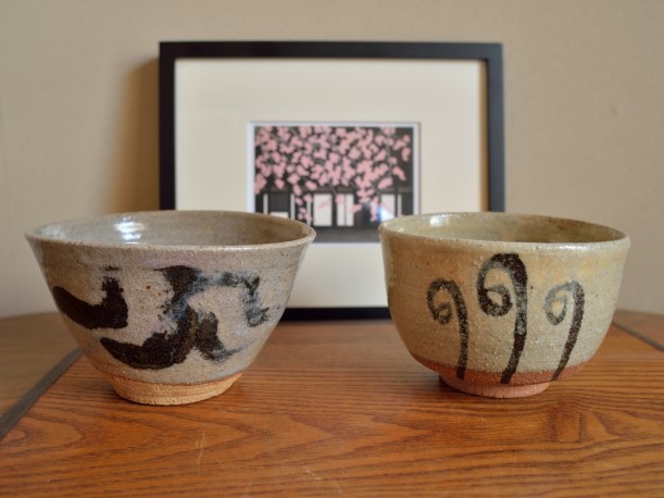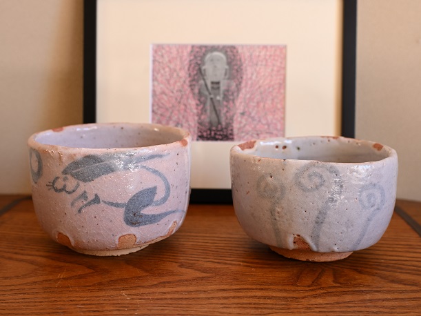 自作の志野茶碗の中で春に合うものを選びました。左の碗は桜もぐさ土によって全体にピンク色に発色しています。右の茶碗は曾木もぐさ土を使い志野釉は白濁してややグレー色です。