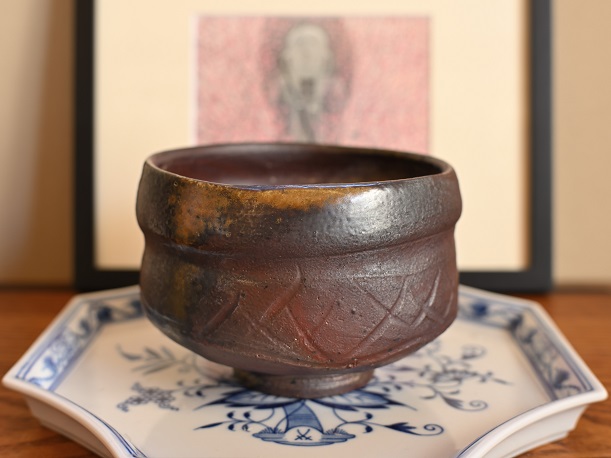 備前の茶碗は冬を除いて使えます。この腰高の漏斗状の姿は春に合っていると思いました。硬質の焼きが特徴です。