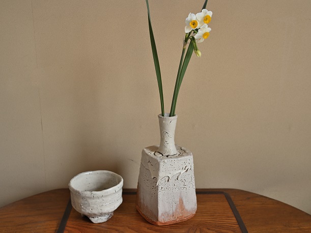 今回は特に白色の花入れ 白萩や志野を選びました。年始に白色がしっくりくると思いました。また、亡き母は白い花入れを好きでした。