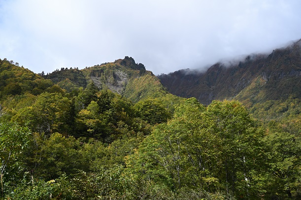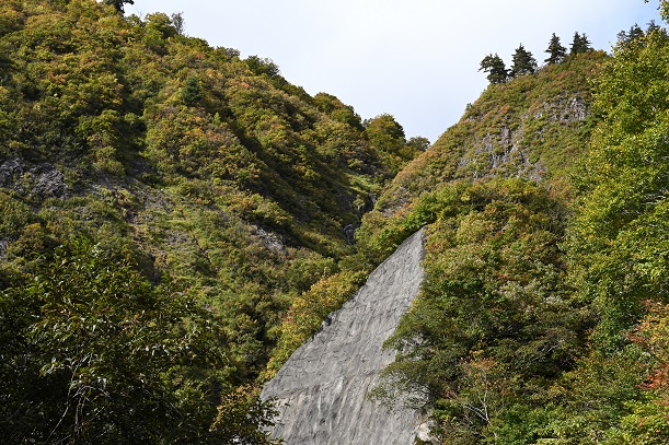 途中、スラブの岩肌の急峻な谷にいくつもの滝が見える所(滝の沢)や、登行欲をそそる岩峰や山肌があったりしてさすがに車を止めて写真を撮りました。
