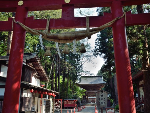 会津高田には朝7時に着いたので 境内に人はいなくて静かでした。大鳥居、桜門は立派ですが、その沿道にはやたらと看板が目立ちます。桜門をくぐった先にあるはずの本堂と拝殿は、2008年10月に大火事で焼失していて小さな仮殿に移されていました。跡地には石の基礎のみが残っていました。再建のための寄付を募る看板が目立っていて、少しむなしい思いがしました。