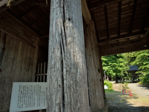 先ず、古びて朽ちかけた小さな仁王門があります。本来あるべき金剛力士像は他の場所に保管されているとのことです。写真は仁王門の柱ですが 凄いでしょう。右の奥には、胴鐘(室町時代のもの)を吊るす建物が見えています。この建物も古びていますが、やたらと大きくて、胴鐘はとても高い位置に吊るされています。