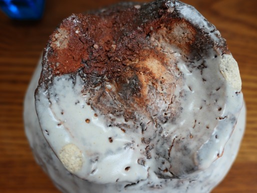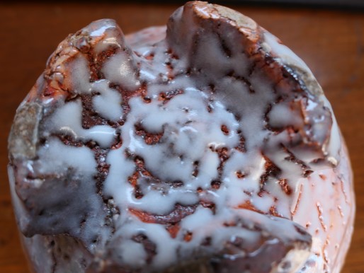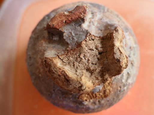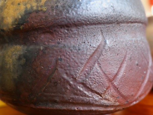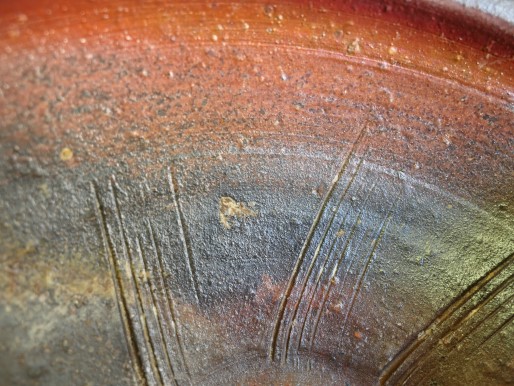 すり鉢の内側の写真です。見込みの中心から縁にかけて土色が徐々に変化していてきれいです。このように微小領域のダイナミックな変化を楽しめるのが備前焼だと思います。