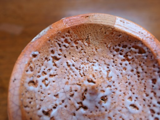 2007年に茨城県陶芸美術館で開催された「三輪壽雪の世界」展を見に行ったときに、併設のショップで萩焼を販売していて購入したものです。 土は全体にオレンジ色に発色していて、半透明の白い釉薬とともに伝統的な萩焼の雰囲気です。