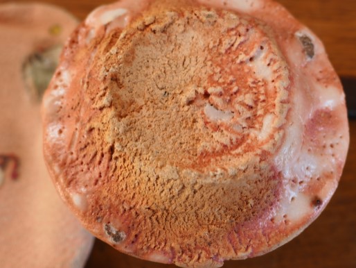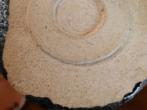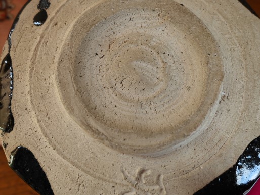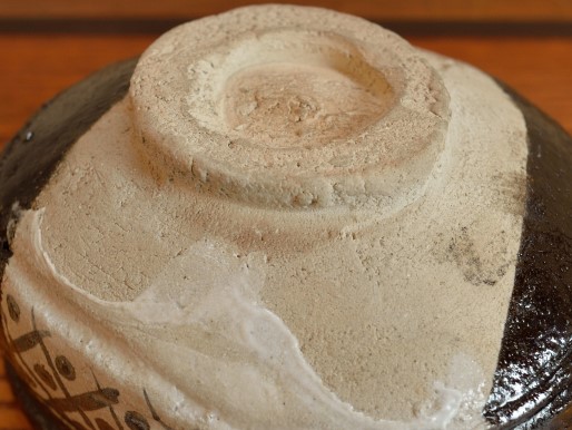 美濃焼ミュージアムで許可を得て撮影した桃山時代の黒織部茶碗の陶片です。高台部の土が露わになっていて当時の土を観察するのに好都合です。やはり、現代陶の土と異なっていますね。けっこう焼きしまっている土です。