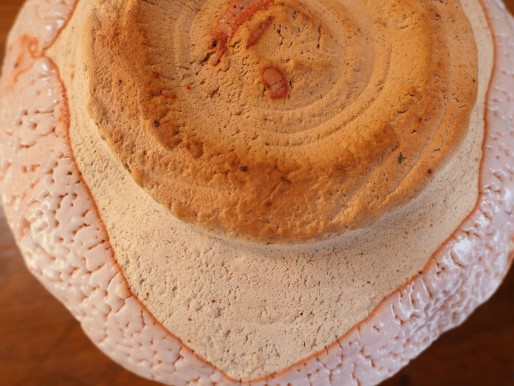 堀一郎氏の志野の土は独特です。少し赤みを帯びた土で、このため志野釉の発色はピンクがかっています。
