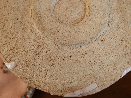 この茶碗の志野釉はおとなしいのですが、高台まわりの土味は 粗くてさくい「もぐさ土」の特徴が良く出ていると思います。細かな長石が混じっていますが、これはあえて加えています。